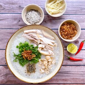 Một phần Cháo gà và nấm rơm chứa nhiều chất dinh dưỡng, lành tính, dễ ăn, dễ tiêu hóa với hương vị thơm ngọt đặc trưng của GÀ HÀN THUYÊN.