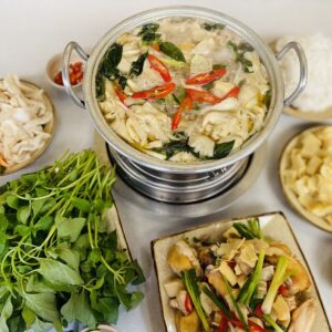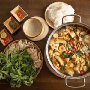 Lẩu có vị thơm tự nhiên của Lá é Phú Yên, hơi cay của tiêu xanh, thanh ngọt của gà, trứng non, nấm, măng tươi. Ăn kèm bún tươi